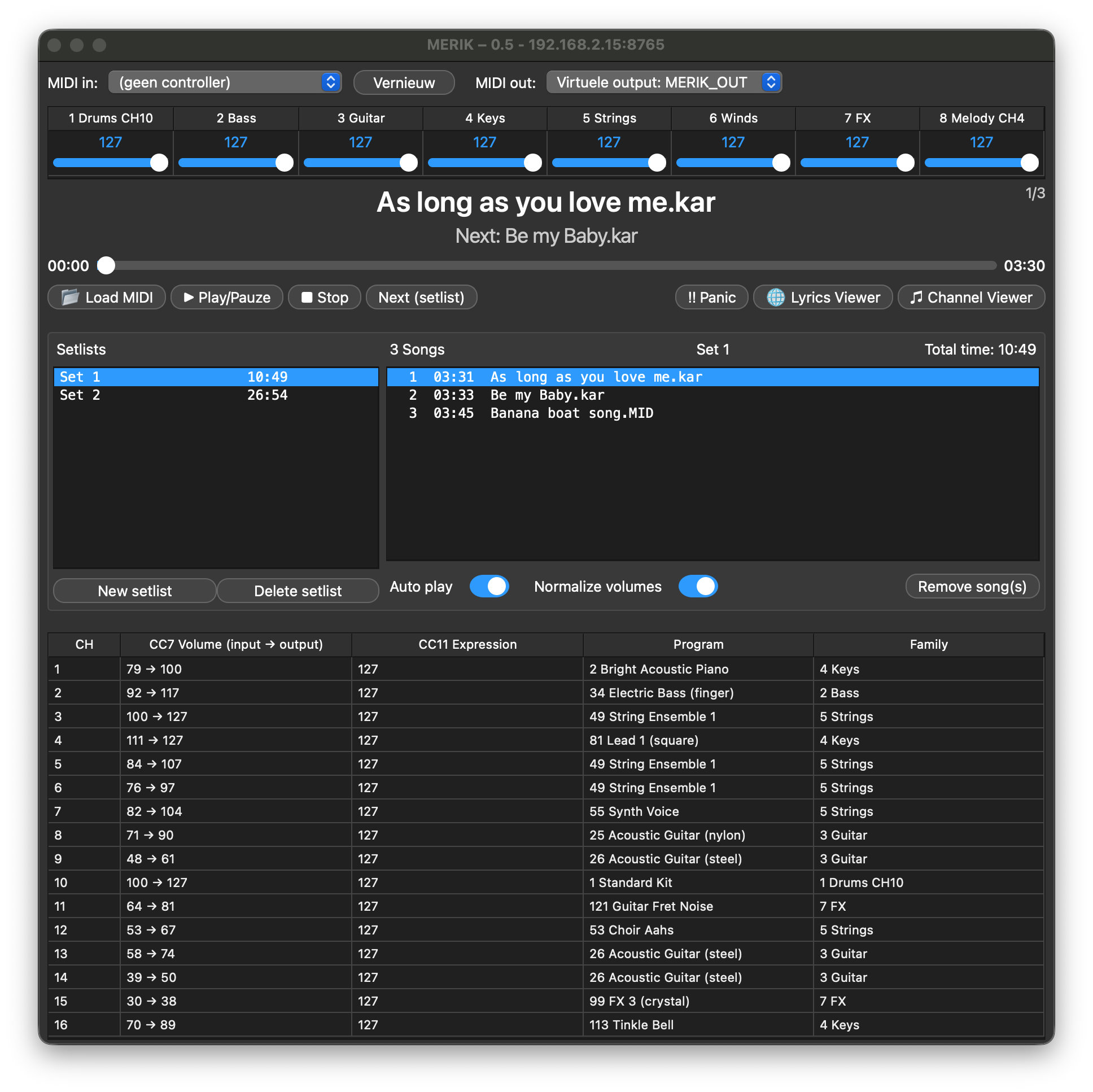 Merik is a lightweight, rock-solid MIDI player for live use. Build setlists, mix MIDI channels per “family”, send lyrics to a tablet and control everything from your nanoKONTROL or keyboard