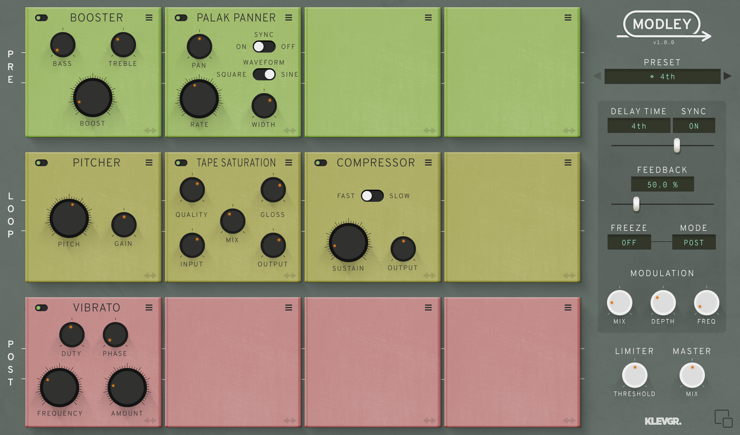 Modley is a modulation delay with effect insert capabilities, which lets you design the whole delay signal with several carefully selected effect modules to create unique signal flows. The idea behind Modley is to push the boundaries of what a delay effect is capable of – only your imagination sets the limits! While Modley sure can be used to do all the traditional tricks – Stereo delay, Tape delay, Short slapback delay etc., its true potential lies within the variety of unexpected effect modules that can be applied.