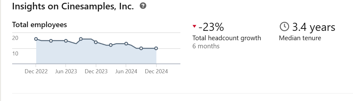 As you can see on the below graph, according to LinkedIn (definitely not the most reliable source for this info, but it’s all we have on this small privately traded business), Cinesamples has had a decline in the total number of employees over the past couple of years. However, it still has a staff of approximately 10 people, which is more than enough employees to operate this kind of business and I have been told by an industry insider that they have some talented people on the team.
