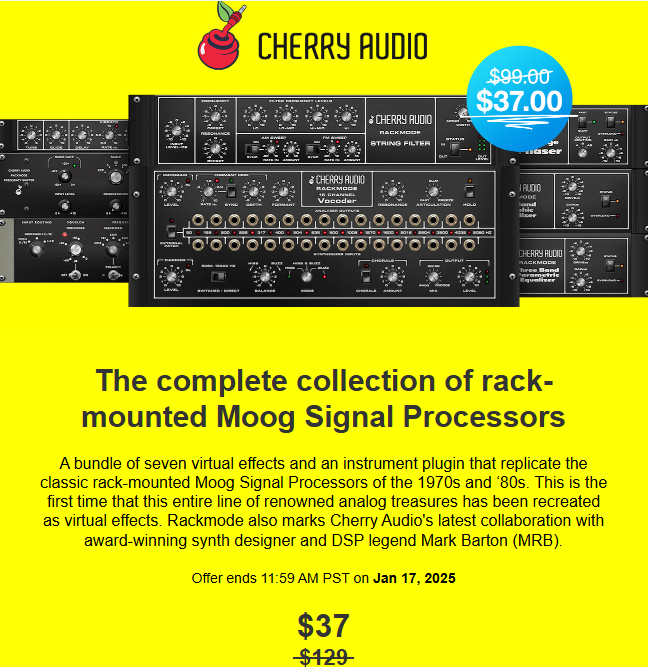 Plugin Alliance PA_EXT Flash Sale – 71% off on Cherry Audio Rackmode Signal Processors bundle, including 7 effects and one instrument plugin that replicate the classic rack-mounted Moog Signal Processors – $37 (reg. $129) – until 11:59 AM PST on January 17th.