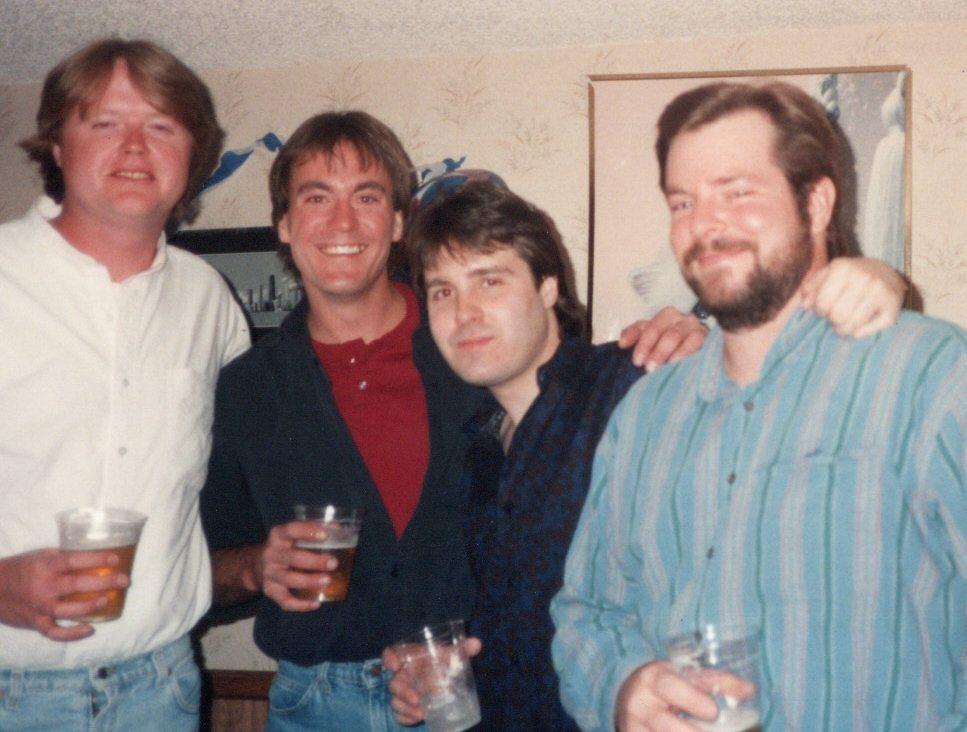 Me and my friend and keyboardist, Dave (Dave’s on the right hand side, I’m the third guy from the left (clearly, a lot shorter than my friends and sporting a mullet — this was the mid 90s when we were working on the original band), the other two guys are other friends of mine, the first guy, Ed, plays guitar and I should ask him to join LM — in fact, I think I’ll talk to him about it this week).