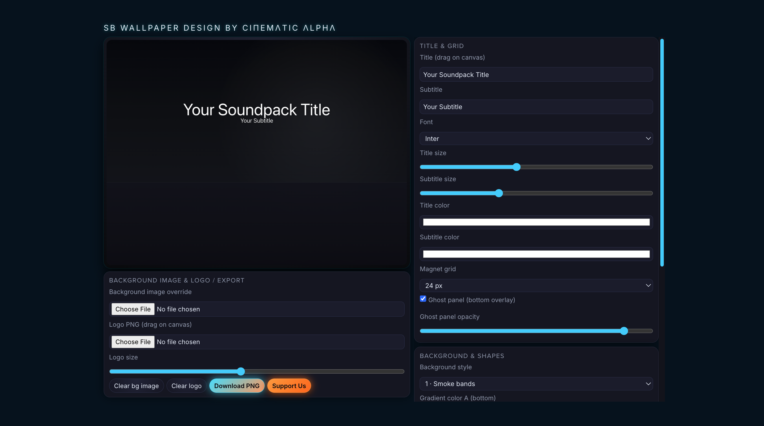 SB Wallpaper Design is a fast and intuitive browser-based tool to create 1024×768 abstract wallpapers for your Soundbox artwork and releases.