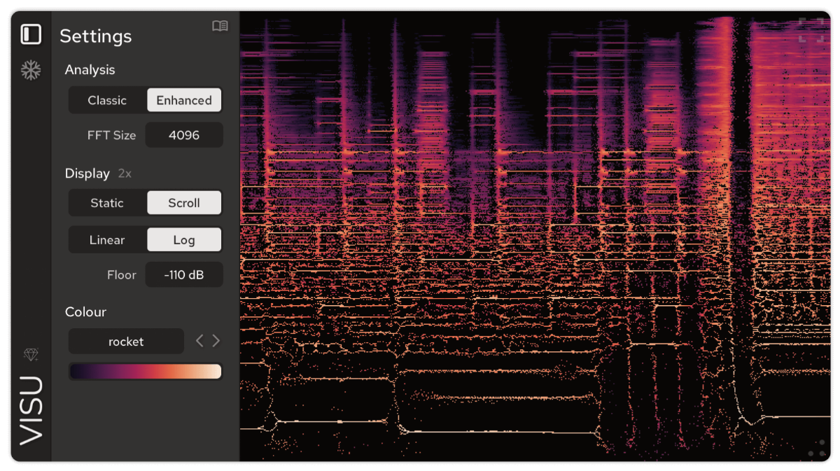 Alongside the classic spectrogram display, Visu includes an enhanced mode with greater precision in both time and frequency.