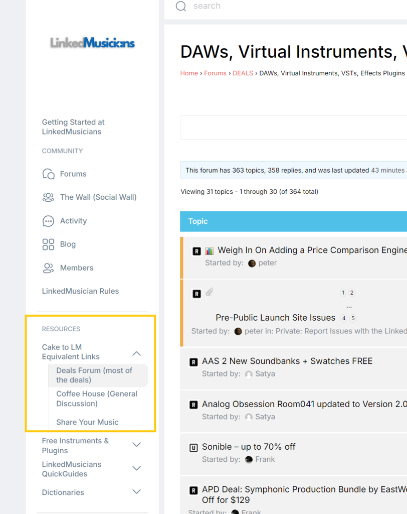 | USER EXPERIENCE TO GET TO DEALS SUBFORUM | Cakewalk.com | LinkedMusicians.com (light version) | LinkedMusicians.com (dark version) |