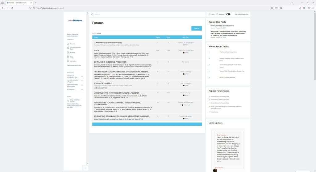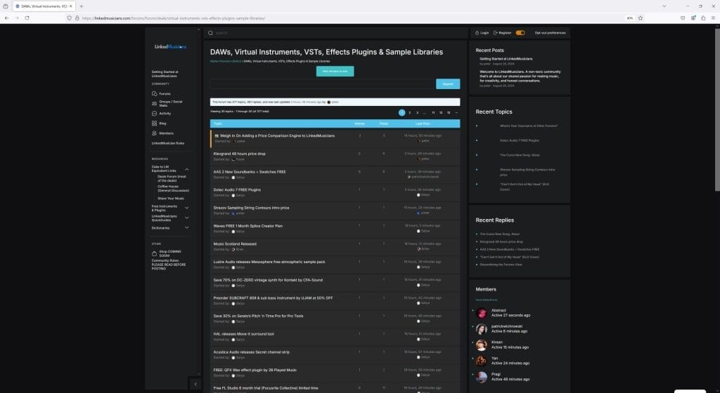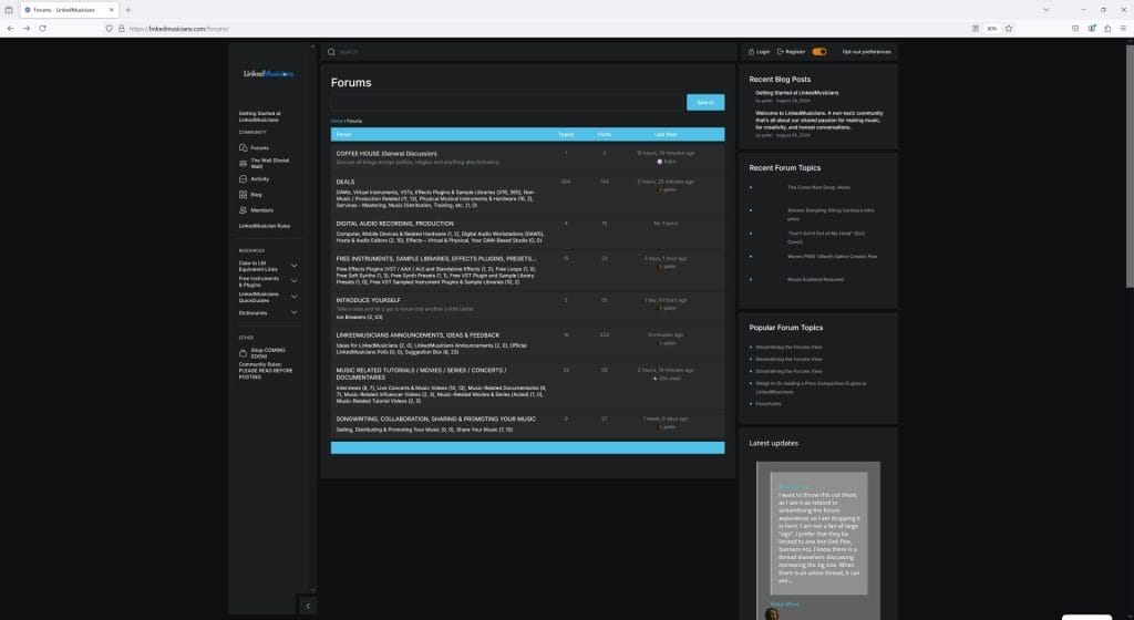 The same page in the dark version. Again, not an option with Cakewalk Forums. Why does Linked Musicians offer this? Because there was a poll where I asked you what you wanted. It was clear that the ideal was to have a light / dark option, so that became a requirement for the site design.