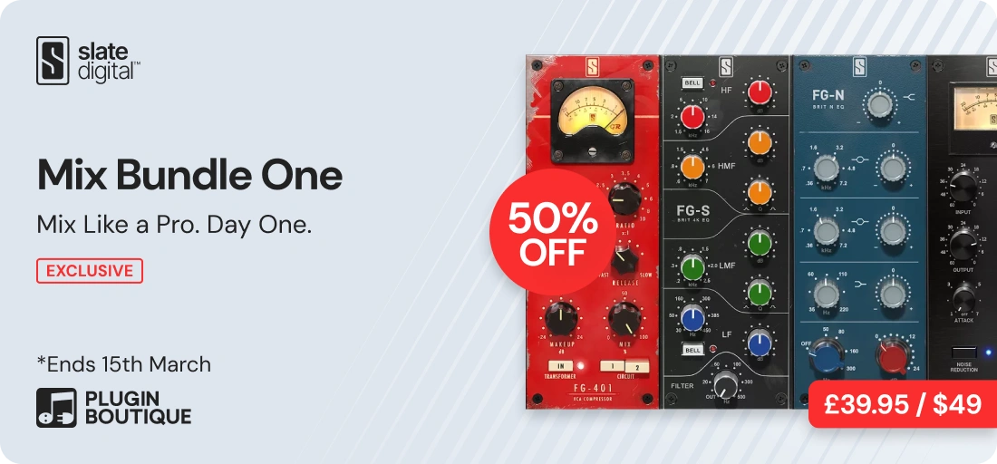 Build a complete, analog-modeled mix chain in seconds. Mix Bundle One gives you four of Slate Digital’s most iconic modules – compressors, EQs, and tools trusted by industry pros, all in one streamlined package. Plus 3 bonus modules for free, totaling 7 industry acclaimed plugins in one rack. Buy now and save 50% in our… -